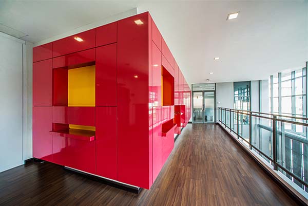 Main entrance stands a free standing bare faced concrete wall to greet visitors representing the company’s role in journalism and in support of free speech and reporting on factual basis. Services are grouped on the east side of the building to free up space for a multimedia open plan workspace and amenities open for public such as multi-purpose hall and research centre. All staff enjoy abundant daylight and view through glass windows. The interior space are designed to express externally with the usage of mass, void, shadow, and colours. The corporate red colour was used as feature colour of the building internally and externally. Horizontal aluminium sun shade louvres are incorporated onto windows to treat glare from sunlight and heat penetration into the building. End result is a simple and environmentally friendly building.